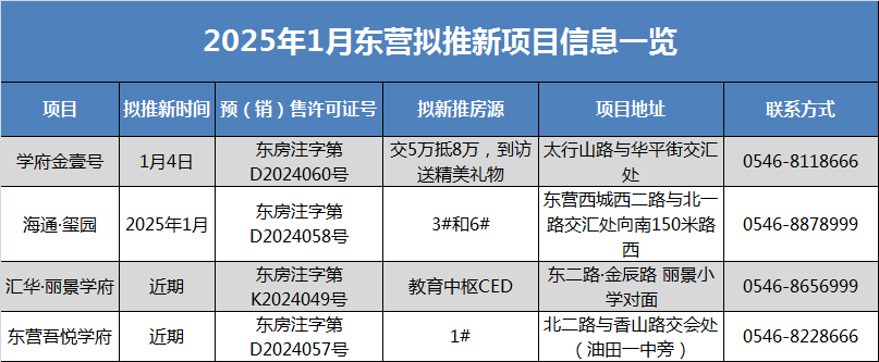 2024年已收官,東營樓市至少有金湖學府(樓盤詳情戶型圖相冊地圖0546-2329999)B區、海通新邦?山河城、學府金壹號(樓盤詳情戶型圖相冊地圖0546-8118666)、銀河?央璽、廣饒眾凱學府(樓盤詳情戶型圖相冊地圖0546-6620777)、眾成名園(樓盤詳情戶型圖相冊地圖0546-8527666)、海通御墅芳華等7個項目推新。2025年來了!東營又有哪些項目要率先開盤?看過來!