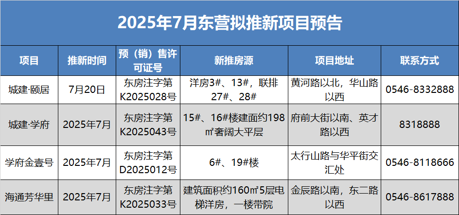 據不完全統計,2025年7月,東營樓市至少有城建·頤居、城建·學府(樓盤詳情戶型圖相冊地圖8318888)、學府金壹號(樓盤詳情戶型圖相冊地圖0546-8118666)、海通芳華里等4個項目推新,涵蓋洋房、聯排、疊墅等,以改善類房源為主。