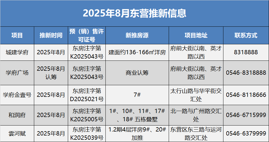 據了解,2025年8月,東營樓市至少有城建學府、學府廣場、學府金壹號(樓盤詳情戶型圖相冊地圖0546-8118666)、和潤府(樓盤詳情戶型圖相冊地圖0546-6715999)、雲河賦(樓盤詳情戶型圖相冊地圖0546-6379999)等項目推新,其中學府廣場商業開始認籌。