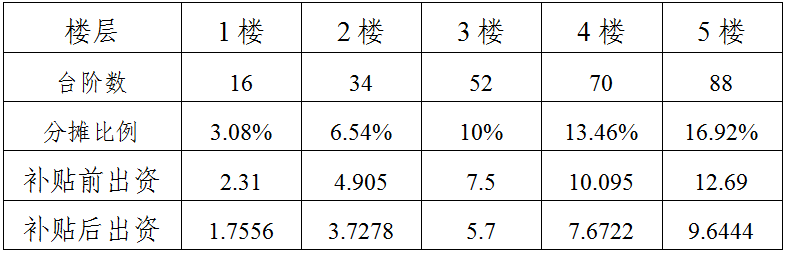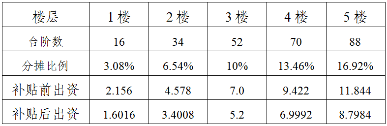 2.僅以住宅總層數5層,首層16個臺階,2層以上每層18個臺階舉例,不同小區,不同樓層,不同臺階數,分攤比例有所不同。