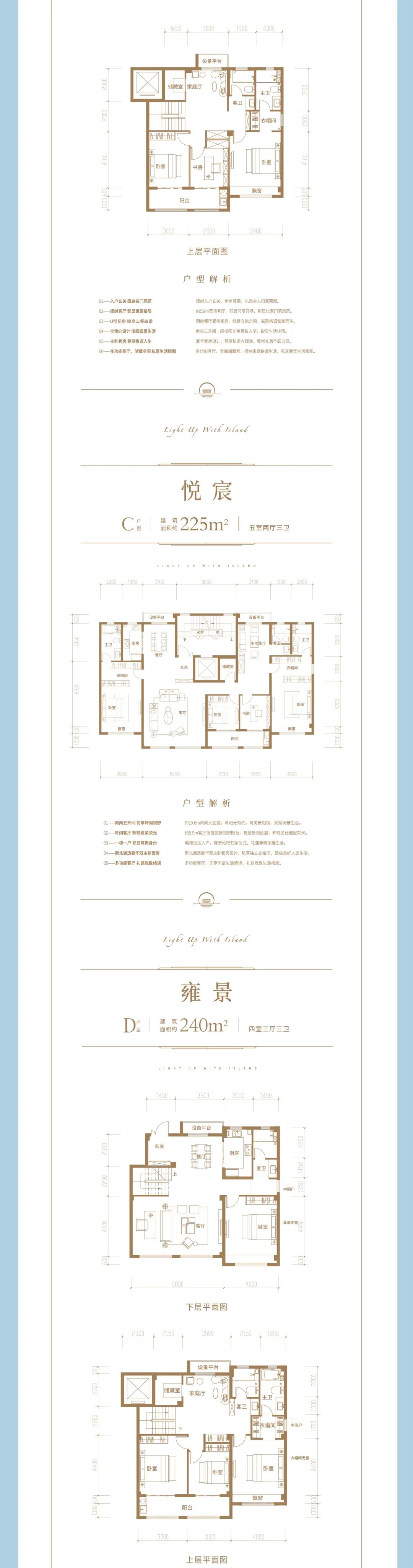 眾成·悅島華庭將美好的空間設計在建面約190-240平寬境疊拼/大平層中一一勾勒,L (客廳)D (餐廳) K (廚房) 設計,(部分)客廳并聯書房,將客廳、餐廳和廚房進行多重功能空間的有效互聯,勾勒出十足的空間感。家庭核心主場中,美好交流自此無邊界。